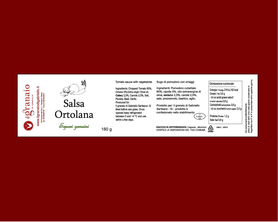 La salsa Ortolana selezionata per voi dal Granaio di Gabriello è un condimento semplice e genuino a base di pomodoro, cipolla, aglio, sedano, basilico, prezzemolo e pepe.